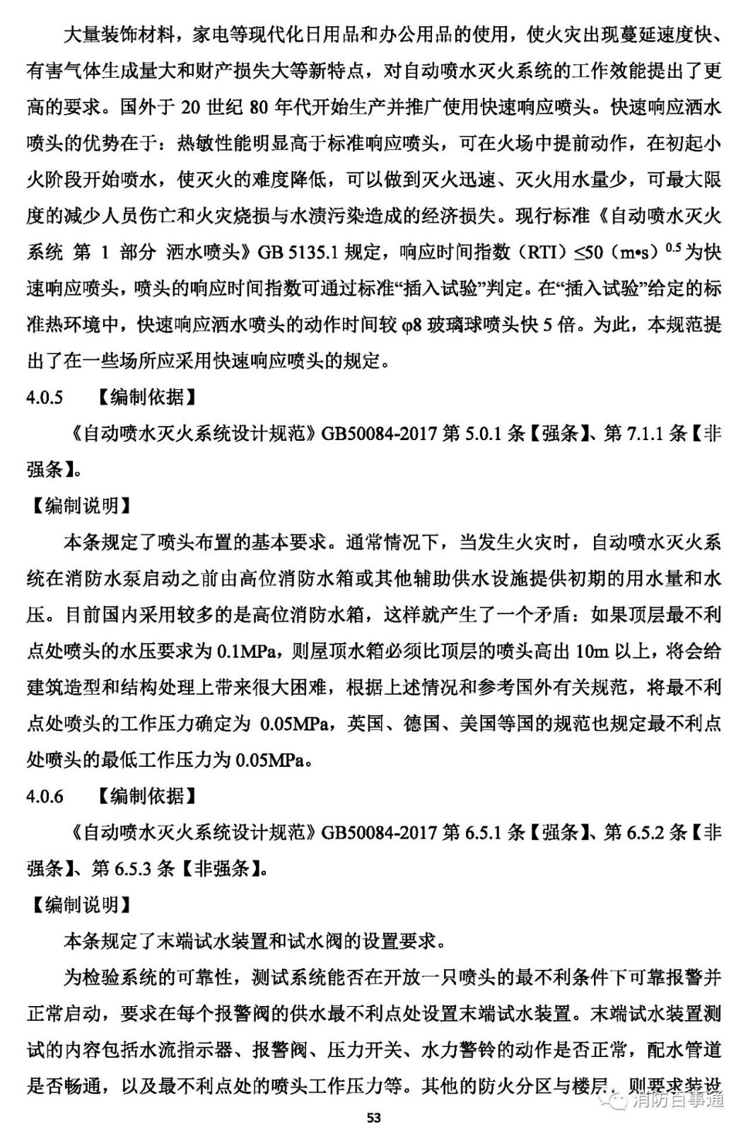 4.0.1 工業和民用建筑內的自動噴水滅火系統,其噴水強度、作用面積、噴頭工作壓力、噴頭間距等參數應與其火災危險等級、室內凈空高度等相適應。