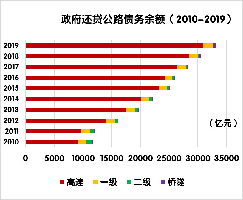 與上年末相比,政府還貸公路債務余額由30536.1 億元增加到33147.7億元,凈增 2611.6億元,增長8.6%。其中,政府還貸高速公路債務余額由28420.3 億元增加到30889.7 億元,凈增2469.4 億元,增長8.7%。