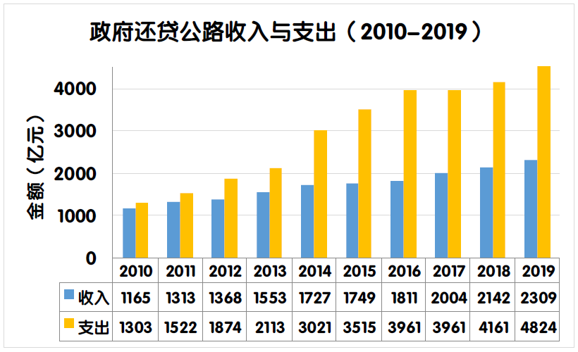 與上年相比,全國政府還貸公路支出總額由4160.7億元增加至4823.9 億元,凈增663.1億元,增長15.9%。其中,償還債務本金支出凈增444.2億元,償還債務利息支出凈增87.8億元,養護支出凈增85.7億元,公路及附屬設施改擴建工程支出凈增22.0億元,運營管理支出凈增20.2億元,稅費支出凈增4.1億元,其他支出凈減0.8億元。