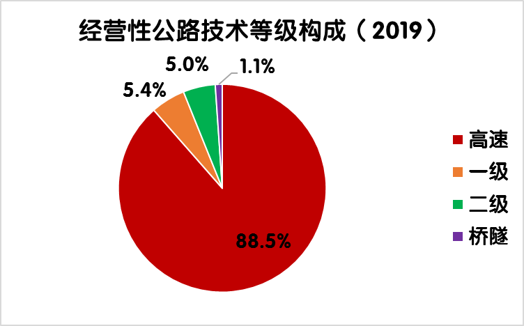 2019年末,全國收費公路里程17.11萬公里,占公路總里程501.25萬公里的3.4%。其中,高速公路14.28萬公里,一級公路1.86萬公里,二級公路0.87萬公里,獨立橋梁及隧道1024公里,占比分別為83.5%、10.9%、5.1%和0.6%。
