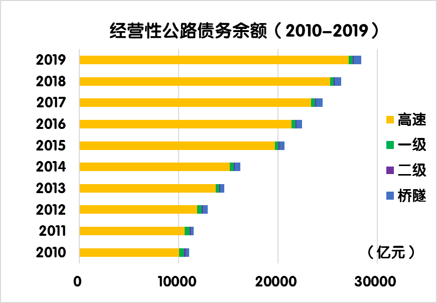 與上年末相比,經營性公路債務余額由26377.5億元增加到28387.6 億元,凈增2010.1 億元,增長7.6%。其中,經營性高速公路債務余額由25245.9 億元增加到27154.9 億元,凈增1909.0 億元,增長7.6%。
