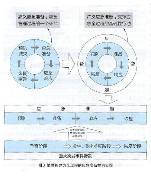 (一)全過程、多角度的情景分析。經典的應急管理理論,將應急管理過程劃分為四個階段:預防、準備、響應和恢復。近十年應急管理學界逐步認識到應急準備的重要性,將其從單純一個過程環節提升為“支撐應急全過程”的基礎性行動,進而有了“廣義應急準備”和“狹義應急準備”兩個不同的概念,如圖3所示。