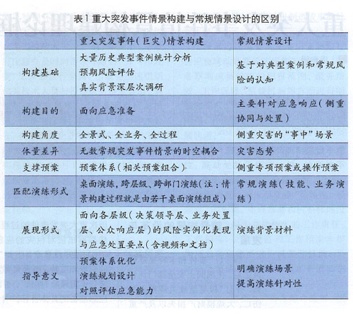 在傳統應急管理中,實戰演練之前往往開展情景設計,常規情景設計與重大突發事件情景構建無論在研究體量、研究目的,還是研究意義都存在著一定的差異,如表1所示。