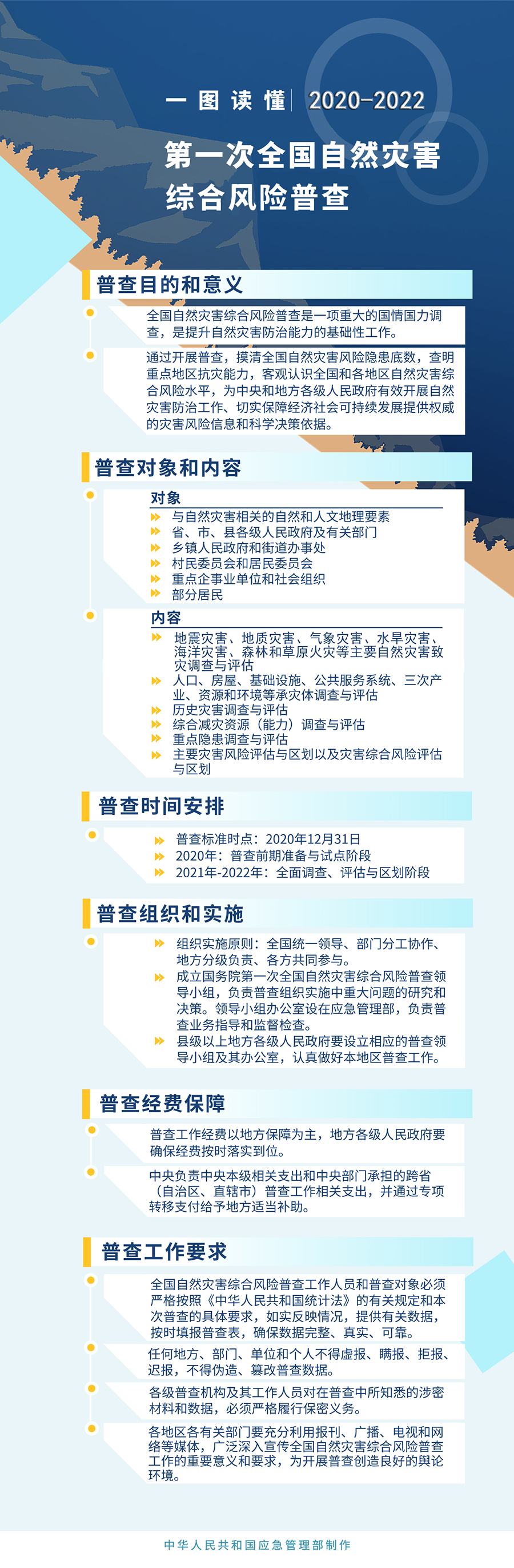 過去一年多來,應急管理部會同多個部門和單位,組建了全國自然災害綜合風險普查技術組,凝聚100余位專家的力量,論證編制普查相關方案。普查方案明確了三個基本目標,分別是:摸清全國自然災害風險隱患底數,查明重點區域抗災能力,客觀認識全國和各地區自然災害綜合風險水平。