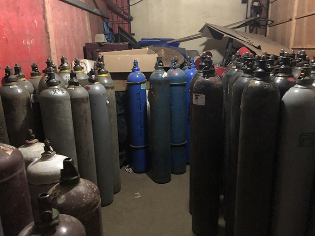 浙江杭州市案例:2021年3月8日上午,浙江省杭州市蕭山區應急管理局執法人員對某公司進行執法檢查。期間,執法人員發現廠區內一簡易鋼棚搭設的倉庫,玻璃窗均被物體人為遮擋,檢查發現倉庫內堆放了大量危化品,包括滿瓶二氧化碳、氧氣、乙炔、混合氣體、氮氣等176個氣瓶。同時,該倉庫緊鄰公司員工宿舍樓搭設,宿舍樓里還住著數十個工人,一旦發生爆炸,后果不堪設想。