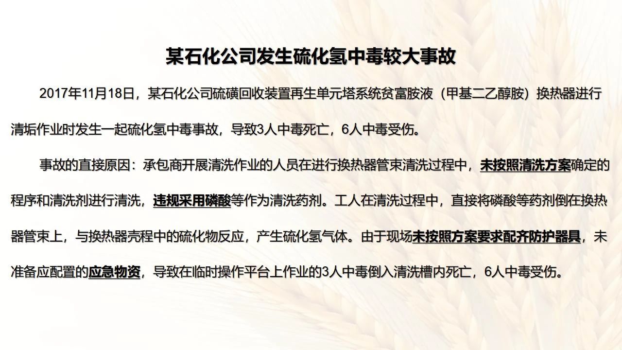 清洗作業使用含硫的清洗劑;裝置、容器、管道、換熱器等,其物料及結垢含有硫及硫的化合物,在一定條件下會產生硫化氫氣體。