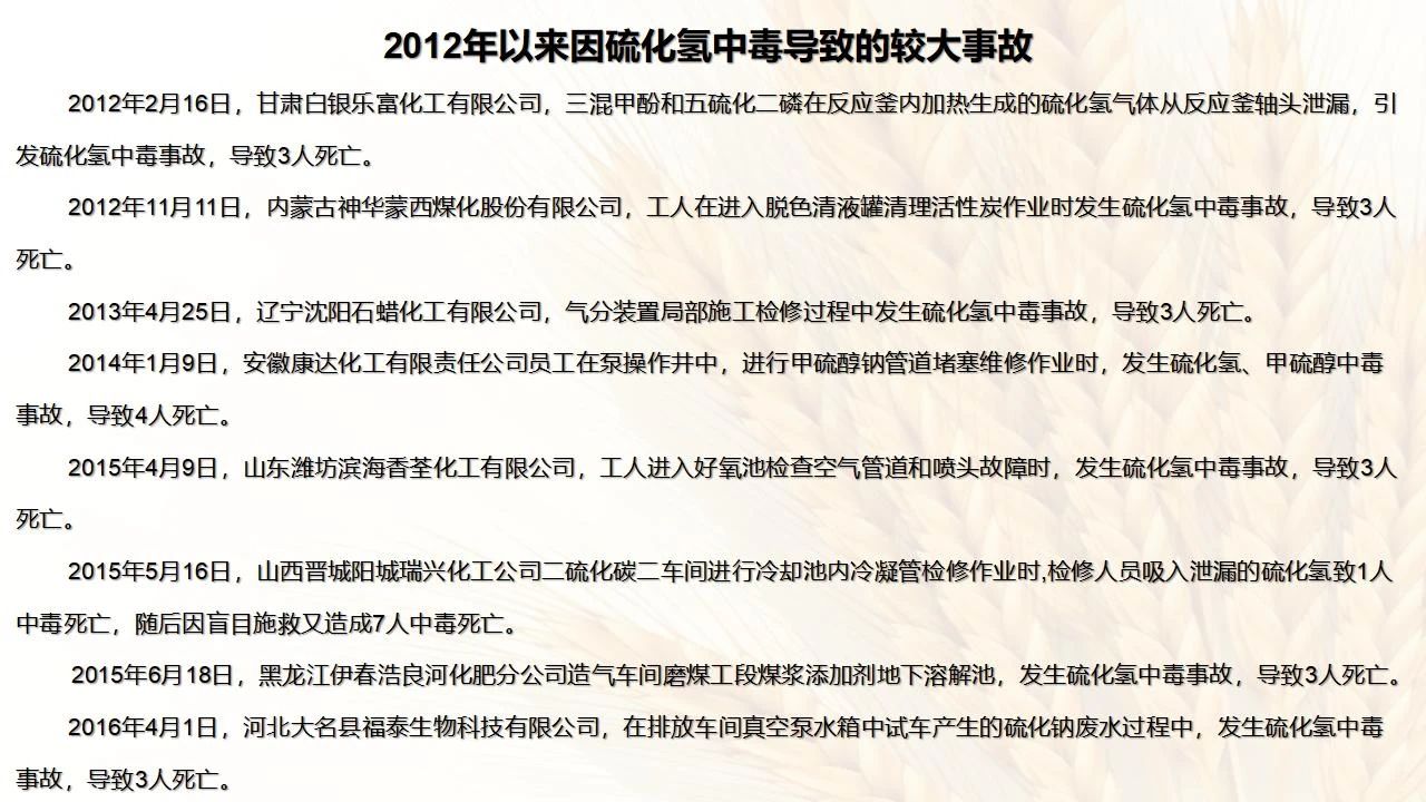 硫化氫中毒多由于含有硫化氫介質的設備損壞,輸送含有硫化氫介質的管道和閥門泄漏,違反操作規程、生產故障以及各種原因引起的硫化氫大量生成或逸出,含硫化氫的廢氣、廢液排放不當,無適當個人防護情況下的密閉空間作業,硫化氫中毒事故時盲目施救等所致。