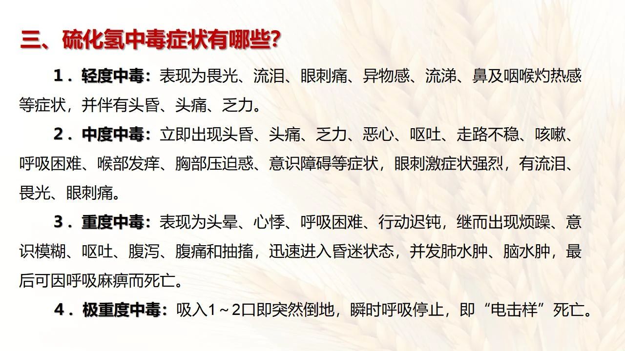 硫化氫中毒后出現頭痛、頭暈、易激動、步態蹣跚、煩躁、意識模糊、譫妄,癲癇樣抽搐可呈全身性強直陣攣發作等;可突然發生昏迷;也可發生呼吸困難或呼吸停止后心跳停止。