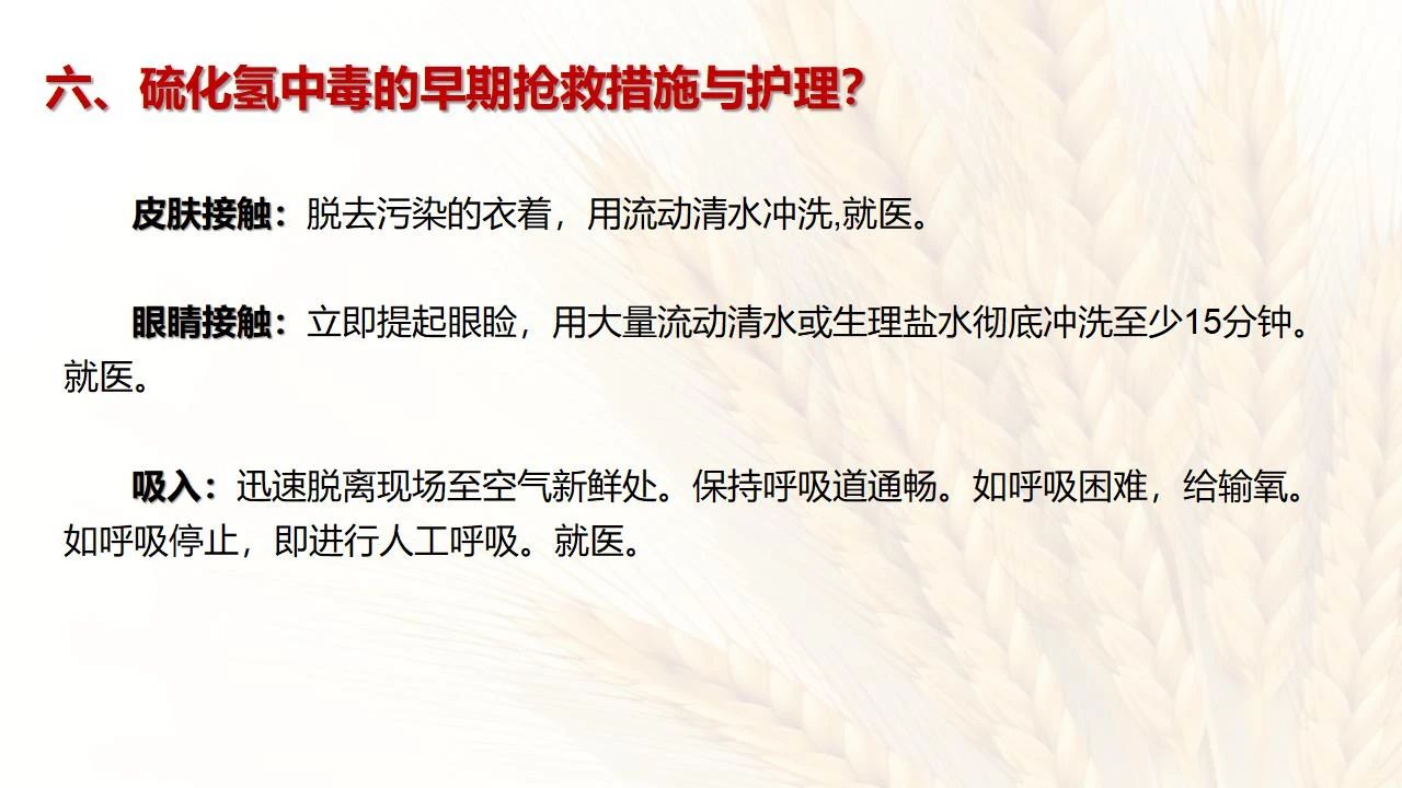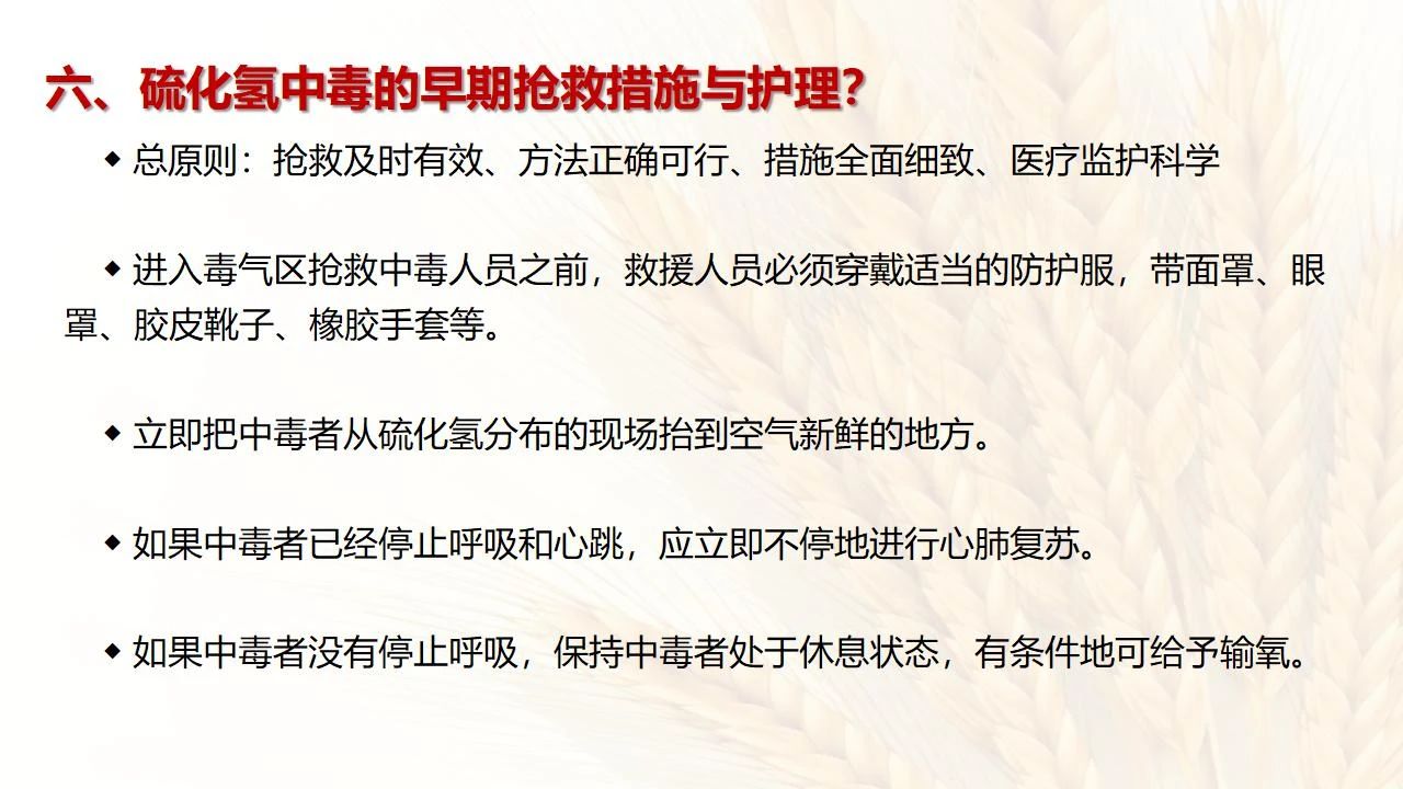 涉及硫化氫的裝置、設備設施應制定硫化氫中毒專項應急預案、現場處置方案,發生硫化氫中毒事故時,參與現場搶救者必須在做好安全防護保障情況下進行施救。應穿隔離衣、戴防毒用具(空呼等),切忌盲目施救,謹防自身中毒。應快速將患者抬離中毒現場,移至空氣新鮮通風良好處,解開衣服、褲帶等,吸入氧氣,及早使用糖皮質激素,適當使用解毒藥物,同時積極對癥處理搶救者。對呼吸停止者,應及時進行人工呼吸,有條件者應及時行氣管插管、機械通氣。