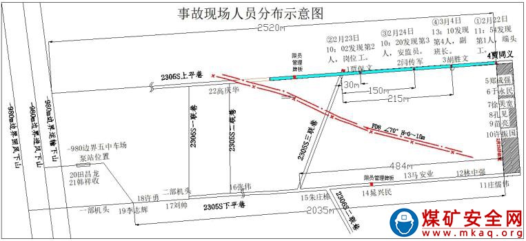2020 年 2 月 21 日 22 時 50 分,綜放一區值班副區長侯二國組織召開班前會,安排當班工作。當班出勤 21 人,另有 1 名跟班安監員。其中限員管理區內 16 人,分別為盯班工區書記 1 人、安監員 1 人、正副班長 2 人、采煤機司機 2 人、支架工 4 人、上下端頭工 4 人、刮板輸送機司機 1 人、機電維修工 1 人;限員管理區以外 6 人,分別為泵站崗位工 3 人、皮帶司機 2 人、限員管理員 1 人(見表 1)。當班班長林中強帶領職工到達工作地點后,各自按照崗位分工組織生產。22 日 1 時 20 分,采煤機開始割煤。2 時 50 分,下平巷第一部帶式輸送機機頭溜煤眼被矸石堵塞,采煤機停機。3時30 分,工區書記高慶華帶領支架工張偉離開工作面,去查看溜煤眼堵塞情況,至事故發生時 2 人未返回工作面。3 時 32 分,采煤機恢復割煤作業。5 時 51 分,采煤機停機,當班割煤 1 刀及 75 組支架長度。限員管理員賈保文駕駛單軌吊進入限員管理區內運輸物料,副班長胡勝文帶領端頭工賈同義進入上平巷及端頭進行收尾工作,此時安監員閆傳軍也從工作面進入上平巷。6 時 17 分 22 秒,2305S 工作面上平巷及三聯巷發生沖擊地壓。工作面部分人員被沖倒,語音電話失效,下端頭作業人員感到從工作面吹來一股強大氣流。班長林中強意識到出事了,立即帶領人員跑向工作面上端頭查看,發現上端頭煤塵很大,能見度極低,然后帶領人員迅速由工作面經下平巷來到 2305S 三聯巷,發現三聯巷上段的頂板和兩幫均嚴重變形,人員無法通過,便迅速返回下平巷,經 2305S 二聯巷到達工作面上平巷,發現限員管理站以里巷道頂板及兩幫均已發生嚴重變形,于是立即去尋找電話報告。6 時 38 分,林中強向綜放一區值班副區長侯二國電話匯報事故情況。6 時 40 分,侯二國向調度室匯報 2305S 工作面發生沖擊地壓事故。7 時 16 分,林中強對現場人員清點確認后,向調度室匯報閆傳軍、胡勝文、賈保文、賈同義等 4 人被困。經核實,沖擊地壓事故發生時,限員管理站以里有 14 人,其中 4 人被困,限員管理站以外 8 人 。