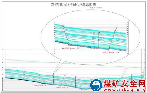 4.5m3/h;該工作面最低標高-994.4m,底板三灰單孔最大放水量1.0m3/h,水壓 1.8MPa,突水系數 0.053 MPa/m。工作面回采過程中基本無涌水。兩條斷層之間形成楔形地塹結構(見圖 4)。