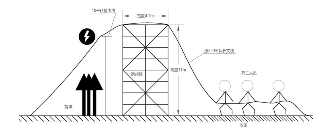 16時(shí)許,楊某某在6-7號(hào)桿塔間10千伏夏屯線北側(cè)剪斷南北走向的原 220 千伏長(zhǎng)文線架空導(dǎo)線后,使用繩子拴住第一、二股導(dǎo)線后在樹上高處進(jìn)行牽引,由王某某、李某某、倪某某3人拉拽到10千伏夏屯線跨越架南側(cè)地面。