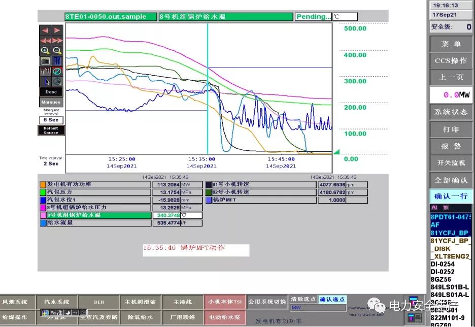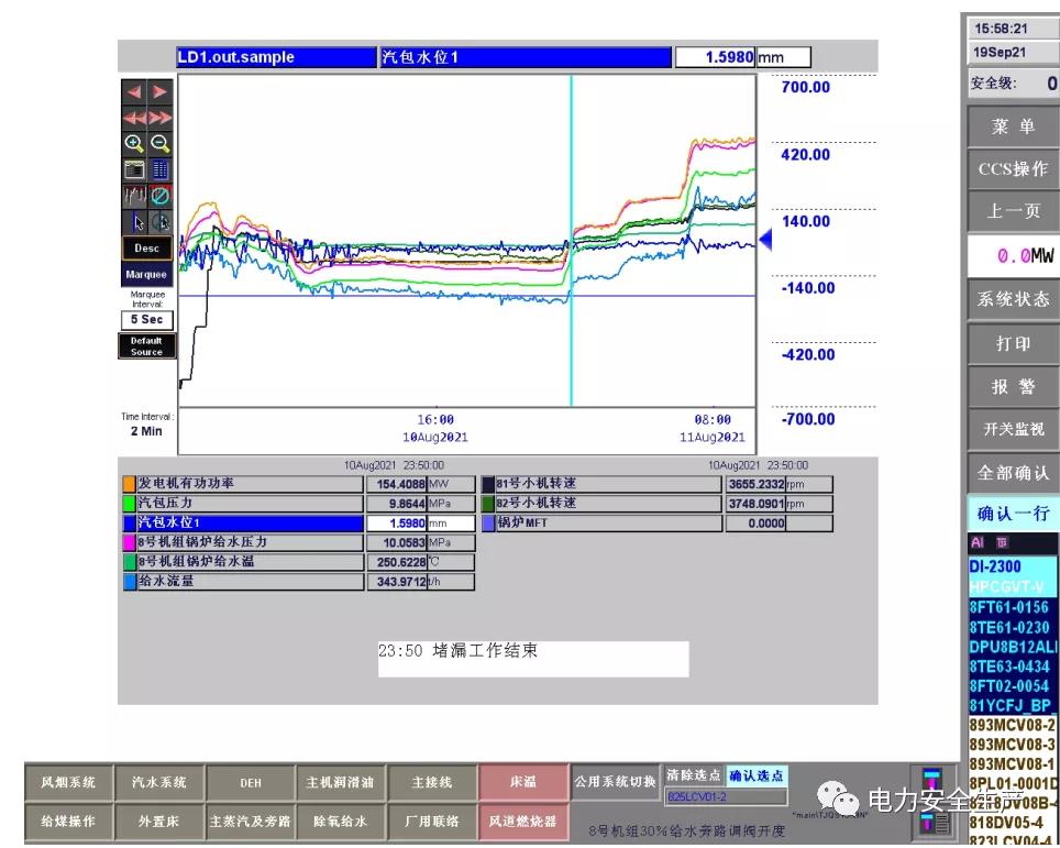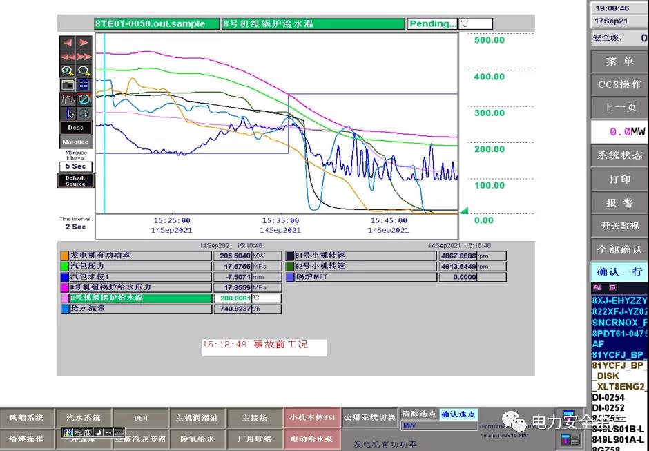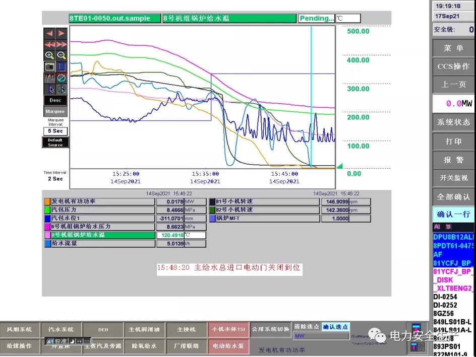 15:22 分,鍋爐給煤量由204t/h 減至 49t/h,汽包水位由-32mm快速降至-188mm。