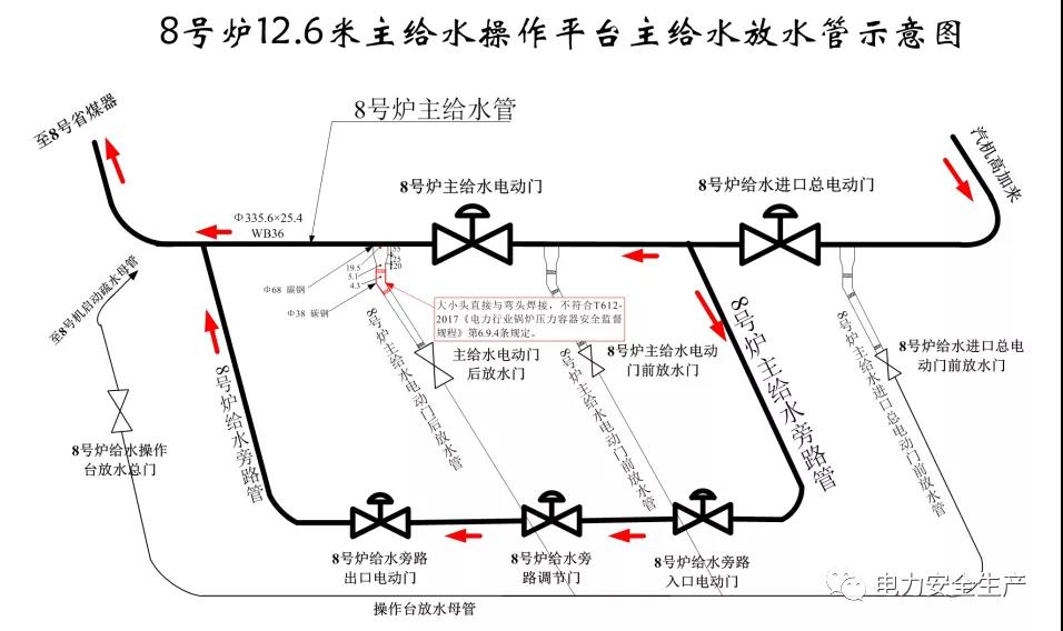 6.調查事故發生后運行應急處置,15時 19 分放水管爆漏,15時 35 分鍋爐 MFT,鍋爐給水壓力仍然維持在13.25MPa;15 時 47 分 28 秒開始關閉 8 號鍋爐給水進口總電動門,15時 48 分 20 秒關閉到位,鍋爐給水壓力8.66MPa;15 時 47分 35 秒開始關閉 8 號鍋爐給水出口總電動門,15時 53 分00 秒關閉到位。事故發生后16 分鐘后給水壓力未有效調整降低,28分鐘后才開始隔離系統,應急處置措施不及時。