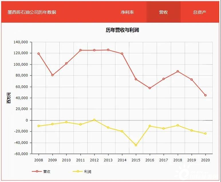 再看2008年至今的財報數(shù)據(jù),這一區(qū)間內墨國油幾乎全部呈現(xiàn)虧損狀態(tài),2020年遭遇疫情嚴重沖擊,虧損額度更是高達230億美元。